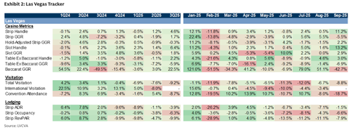 Las Vegas trends remain lackluster,” Goldman analyst Lizzie Dove wrote in a note citing a series of data points, including visitation and gambling metrics, that marked the ninth consecutive quarter of year-over-year visitation declines and continued softness across the Strip in September.