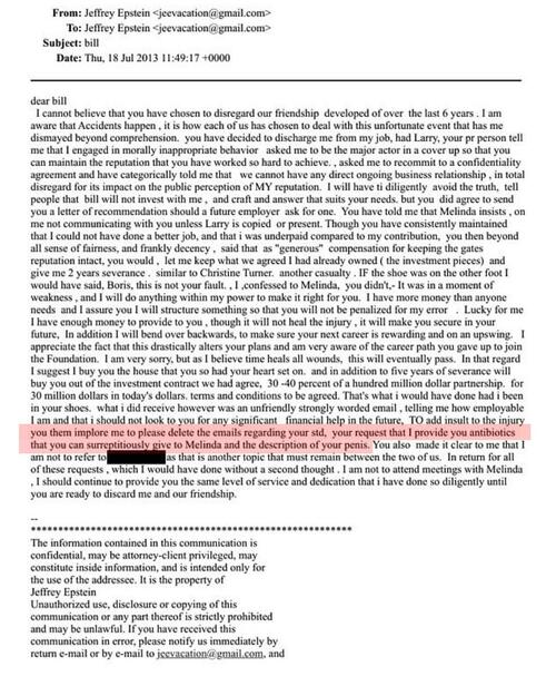 According to the newly unsealed emails, drafted in July18, 2013 but unclear if ever sent, Epstein rants about Gates severing ties with him, accusing the tech titan of hypocrisy after allegedly benefiting from his seedy network. “To add insult to injury you then subsequently with tears in your eyes, implore me to please delete the emails regarding your std, your request that I provide you with antibiotics that you can surreptitiously give to Melinda, and the description of your penis,” Epstein reportedly wrote in one typo-riddled tirade. He went on to claim he helped Gates “deal with consequences of sex with Russian girls,” implying Epstein played pimp in these alleged trysts. The only question for the FBI: were they underage?