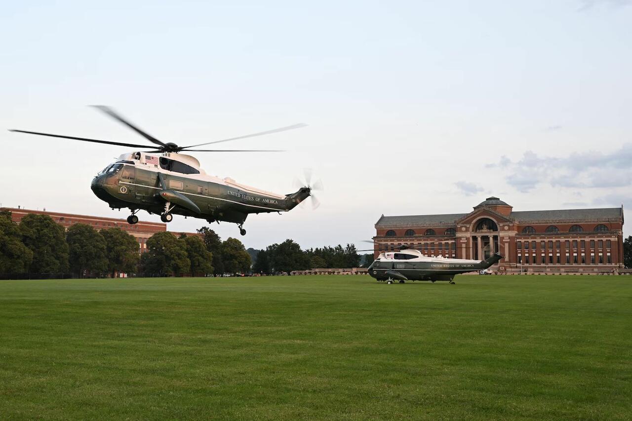 Marine One takes off from Fort McNair in 2023 with President Joe Biden aboard. (Andrew Caballero-Reynolds/AFP/Getty Images)