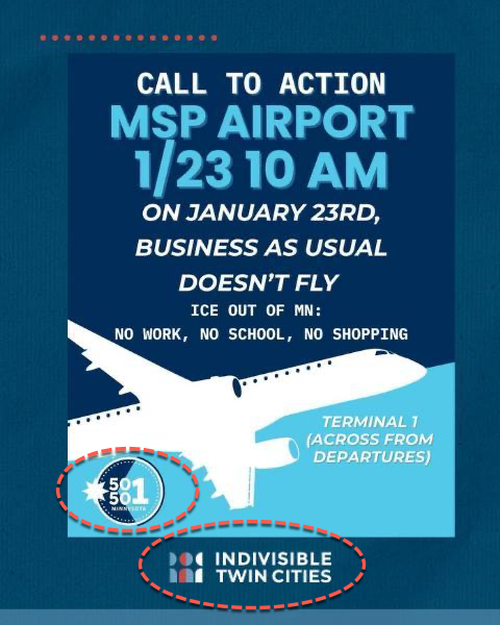 Here’s the flyer showing that Indivisible Twin Cities and 50501, dark-money-funded NGOs, could’ve been the organizers of the event to shut down critical infrastructure: