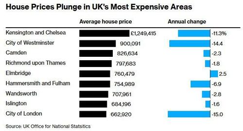 Rumored property tax changes include introducing a new tax on the sale of homes worth more than £500,000, abolishing stamp duty, and introducing a mansion tax on homes valued above £2 million, have dramatically impacted the ultra-high-end luxury home markets with Bloomberg reporting that house prices in the largely-affluent borough of Kensington & Chelsea (K&C) plunging 11.3% YoY, alongside a 14.4% plunge in Westminster.