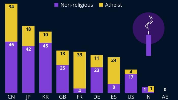 In China, the highest percentage of people among the 32 countries and territories included in the Statista Global Consumer Survey self-identify as non-religious or atheist, the latter group describing people rejecting the idea that there is a God.