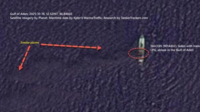 The LPG tanker FALCON (9014432), which caught fire today in the Gulf of Aden, was laden with Iranian LPG from Assaluyeh after loading there on 2025-09-25. She was most likely heading to Ras Isa, Yemen; to supply the Houthis. This vessel was detained in January 2025 in Istanbul… pic.twitter.com/D1kUoUADVi