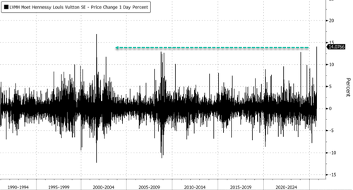 Shares of LVMH Moët Hennessy Louis Vuitton SE in Paris jumped the most since the dot-com era after the world’s largest luxury group unexpectedly returned to sales growth in the third quarter, signaling a potential end to the multi-year luxury downturn that had halved the stock.