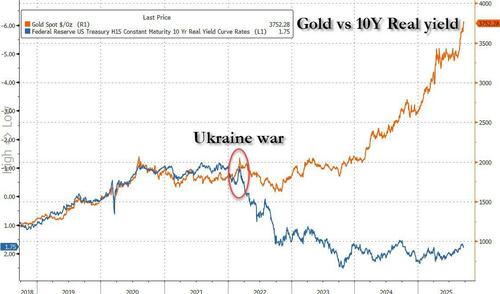 Recall that at the start of the Ukraine war in 2022, G7 countries froze approximately $300 billion in Russian central bank assets, with about two-thirds held by the Belgian clearinghouse Euroclear. At the same time, Russia was kicked out of the global dollar cross-border payments network, SWIFT. The decision to weaponize fiat currencies sparked a historic meltup in gold and led to the disconnect of gold with such traditional drivers of the price as real yields.