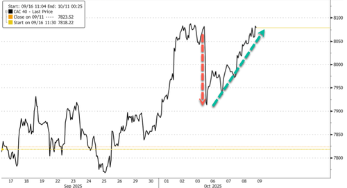 Despite the turmoil, French 10-year yields fell five basis points to 3.51% on today’s news, while the CAC 40 has nearly erased its losses from earlier in the week.