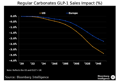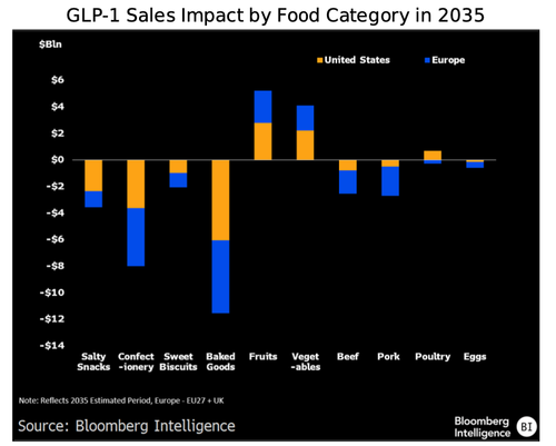 Bloomberg Intelligence analysts Jibril Lawal and Jennifer Bartashus forecast that the rapid adoption of GLP-1 weight-loss drugs will reduce US and European food and beverage sales by $53 billion by 2035.