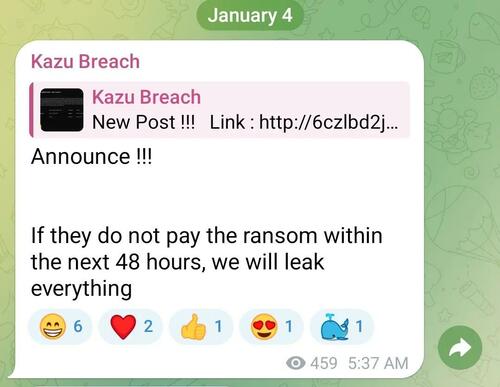 Kazu also threatened to leak the files if the ransom was not paid in the next 48 hours.