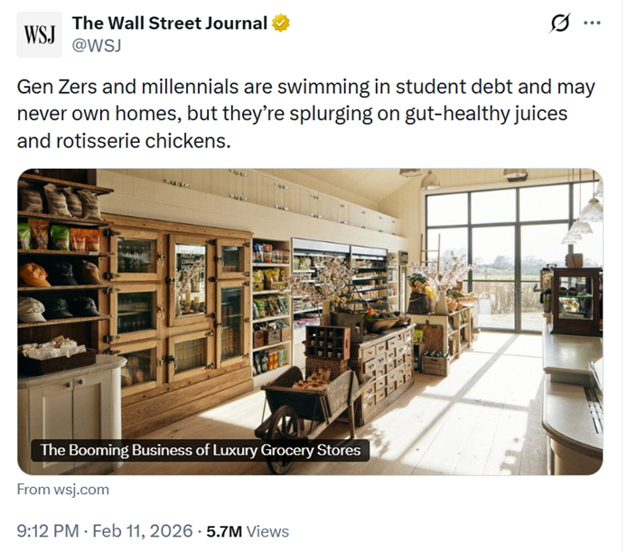 Young New Yorkers are gorging on fancy food while complaining that they cannot afford to buy houses, a Wall Street Journal article on luxury grocery stores in Manhattan stated last week: