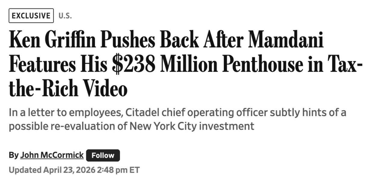 When the Fischer-Price My First Mayor™ of New York Zohran Mamdani chose to film a “tax the rich” video in front of a Manhattan penthouse owned by Citadel CEO Ken Griffin, he wasn’t just celebrating “tax day”, he was making a policy argument.