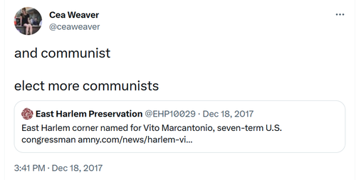 In December, she pushed to “Elect more communists” while a street in Harlem was being renamed after former communist Rep. Vito Marchantonio of Manhattan.
