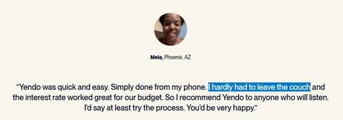Mela from Phoenix, AZ “hardly had to leave the couch” to tap into her car’s equity. And apparently one of the highest interest rates on the planet “worked great” for her budget.