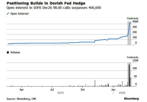 As Bloomberg’s Edward Bolingbroke observes, after months of consensus trades that the Fed’s easing cycle will end in 2026, traders in US futures and options markets are suddenly piling on bets that the Fed will continue cutting rates well into next year instead of raising them.