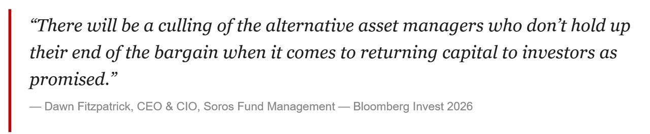 However, as we warned then, the risks have come home to roost. The private equity and private credit industry is heading into a gut-wrenching period of consolidation. That, according to one of Wall Street’s most influential investors, Dawn Fitzpatrick, CEO of Soros Fund Management. She told attendees at Bloomberg Invest this week that a “massive culling” of alternative asset managers is coming. And that the industry has no one to blame but itself.