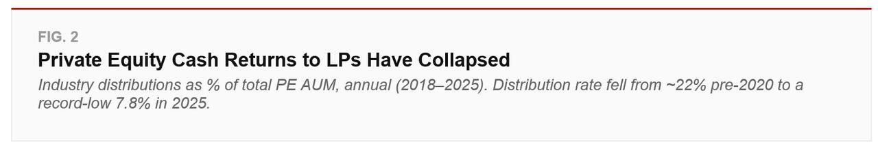 This is the so-called “denominator effect.” That is where falling public equity valuations inflate the proportional weight of private holdings in a portfolio. The result was widespread overallocation across pensions and endowments during the 2022 public market selloff. While public equity recoveries have since eased that mechanical pressure for some, the underlying liquidity problem persists. Notably, private equity is not generating the cash distributions investors need to rebalance and redeploy capital.