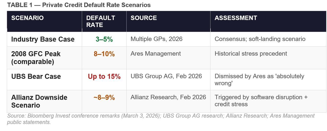 Lastly, Ares Management CEO Mike Arougheti, while dismissing UBS’s most extreme 15% default-rate forecast for private credit as “absolutely wrong,” acknowledged that some portfolios saw loss rates of 8% to 10% during the 2008 financial crisis. That is a data point that takes on new resonance in the current environment.