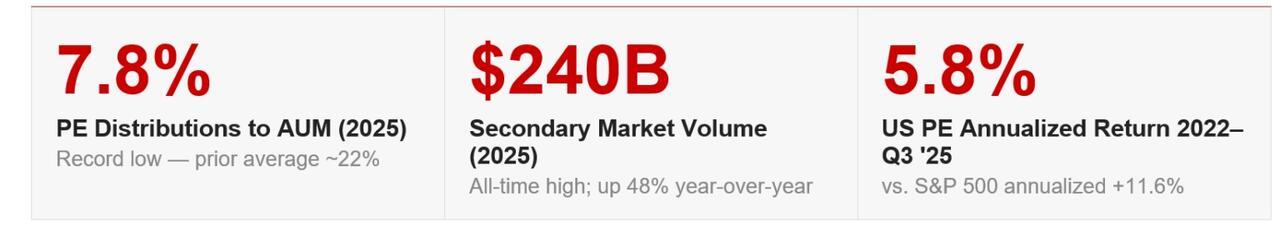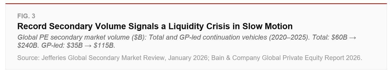 One of the most telling symptoms of the liquidity crisis has been the explosive growth of the secondary market. Secondary transaction volume hit a record $240 billion in 2025, up 48% from the prior year, according to Jefferies. GP-led continuation vehicles, mechanisms that allow managers to hold onto assets longer while offering existing investors an exit option, now account for $115 billion of that total. That number has more than tripled in five years, from $35 billion in 2020.