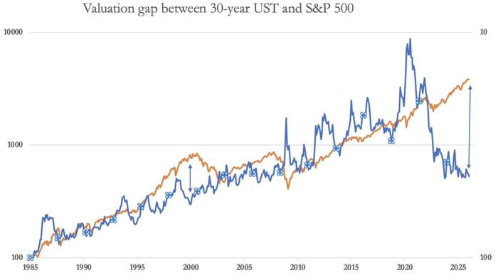 For every debt, there is a credit and in recent years significant quantities of this credit, has found its way into financial instruments, particularly equities. As the interest cost on this debt increases, the credit side of the bubble will burst. Today, the disparity between the returns on long maturity bonds and equities is at an all-time record, illustrated by the chart below: