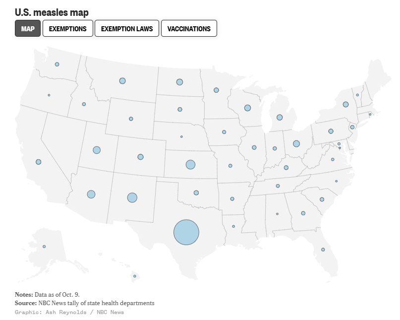 You will have heard about the huge measles outbreak that began in Texas. We also just talked about another outbreak that is currently underway in South Carolina that is seeing hundreds of children in quarantine. But those are certainly not the only places where measles cases in at least double digits are popping up in 2025. Here’s a map that shows where cases are occurring, with the larger circles being a large number of cases.