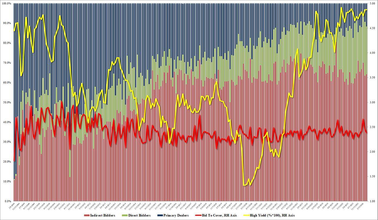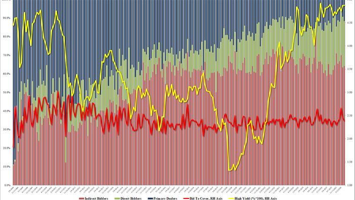 The sale stopped at a high yield of 4.876%, virtually unchanged from 4.871% a month ago and the highest since last July. It also tailed the When Issued 4.871% by 0.5bps, the first tail since November.