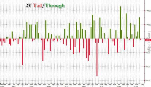 The first coupon auction of the week closed without a glitch, with the $69 billion in 2Y bonds offered pricing at 3.571%, down from 3.641% last month and the lowest since Sept 2024 when the US underwent its latest growth scare. The auction also stopped through the 3.572% When Issued by 0.1bps, a smaller margin than last month’s 1.5bps, but the fifth consecutive through in a row.