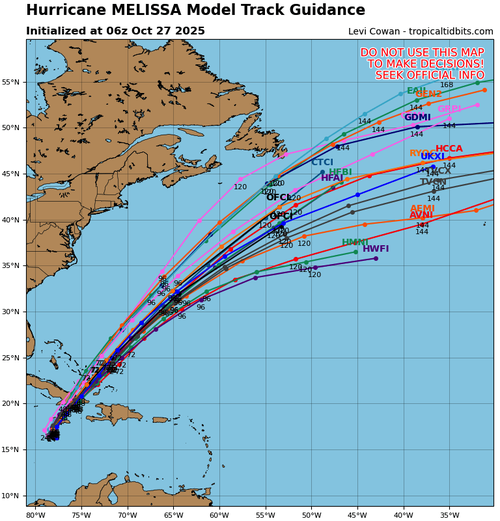 Various computer model predictions agree that Melissa’s track will curve out into the Atlantic Ocean after making landfall across several Caribbean island nations.