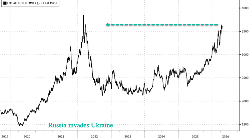 Last week, JPMorgan analysts warned that the aluminum market is descending into a black hole, or a “metaphorical point of no return,” where the “global aluminum market will face a serious and prolonged supply outage,” even if vessel flows through the Hormuz chokepoint resume in the near term.