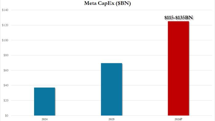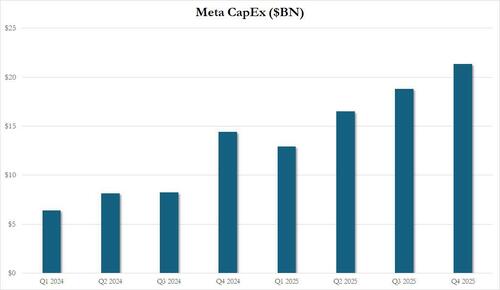 Last but not least, META’s 2026 capex forecast was an absolute stunner: the company said that it anticipates 2026 capital expenditures to be in the range of $115-135 billion, with year-over-year growth driven by increased investment to support our Meta Superintelligence Labs efforts and core business. This is much, much higher than the $110.62BN median estimate, and represents a doubling in capex YoY.