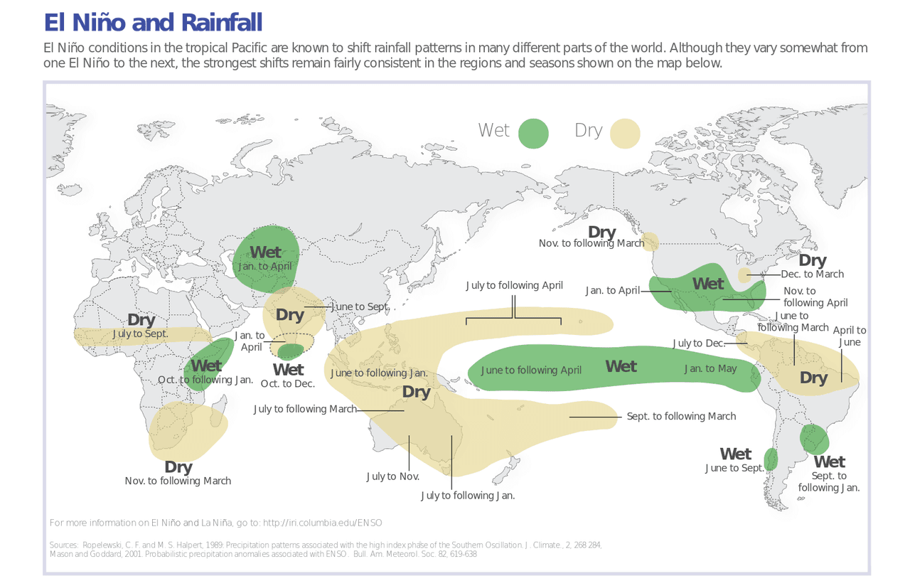 Across the U.S., an El Niño influences seasonal rainfall, especially during winter. The stronger, more active jet stream typically shifts south, bringing wetter-than-average conditions to the southern U.S., including California, the Gulf Coast, and the Mid-South.