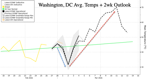 For folks in the Mid-Atlantic, this winter has been historic (see here), despite Al Gore’s broken-record global-warming pitch for the last three decades, repeated at Davos earlier this year. However, warmer weather is set to return to Washington, D.C., with temperatures in the coming weeks reaching 70°F.