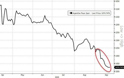 Following his government’s resounding loss in local elections – seen as a harbinger of next month’s congressional races – Argentine President Milei is facing a renewed crisis as the embattled South American country’s currency is collapsing amid fears that he will scrap his defense of the peso (which has already cost hundreds of millions of dollars) and let it plunge as so many of his predecessors have done.