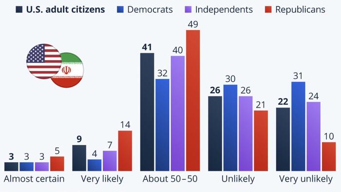 This pattern held true for both Democrats and Republicans, albeit with a higher share of Democrats saying it was unlikely (61 percent compared to 31 percent of Republicans) that a deal would be reached to end the war in Iran. Where 31 percent of Democrats were unsure, saying that there was a 50-50 chance, 49 percent of Republicans took this view.