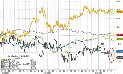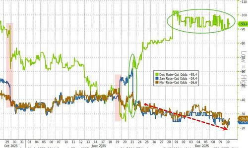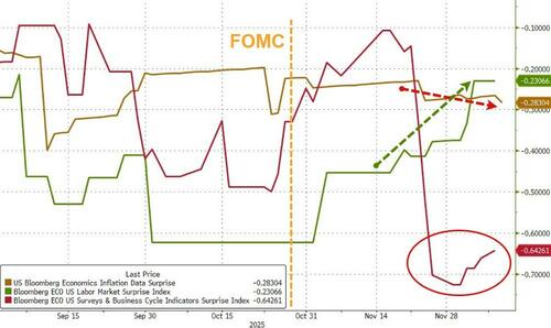 Since the last FOMC meeting (on October 29th), The Fed has largely been flying blind from a macro data perspective (thanks to the government shutdown) with the sporadic ‘hard’ data outperforming while ‘soft’ data has shit the bed and alternative labor market insights remain mixed at best (and extremely lagged at worst)…