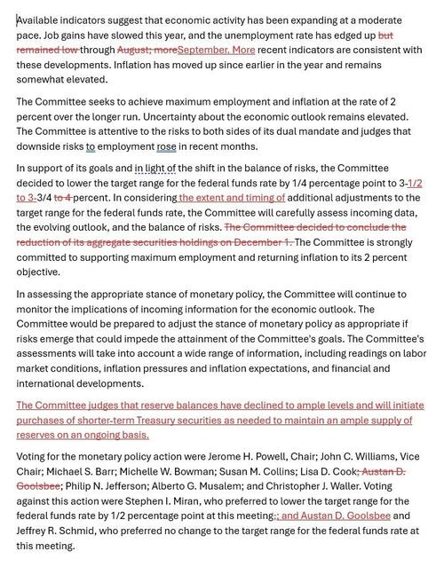 The Fed said reserve balances have declined to ample levels and will use shorter-term Treasury purchases when needed to maintain sufficient reserves. October’s balance-sheet guidance, “the Committee decided to conclude the reduction of its aggregate securities holdings on December 1″ is removed; instead, December adds new guidance: “the Committee judges that reserve balances have declined to ample levels and will initiate purchases of shorter-term Treasury securities as needed to maintain an ample supply of reserves.”