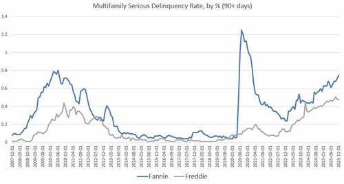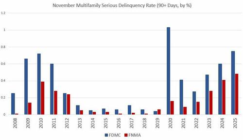 For November, seriously delinquent multifamily mortgages (90+ days delinquent) at Fannie Mae rose to 0.75 percent. That’s up from October’s total of 0.71 percent, and it was up from November 2024’s total of 0.60 percent. Fannie’s delinquency rate has risen quickly since December 2022 when the rate was 0.24 percent. Excluding the covid panic, Fannie’s delinquency rate is now the highest since 2010, but remains below the Great-Recession high of 0.80 percent.