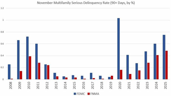 Freddie Mac’s delinquency report, on the other hand, shows delinquencies above the Great-Recession peak. During November, Freddie reported multifamily serious delinquency rate was 0.48 percent. That’s unchanged from October 2025, but up from November 2024’s level of 0.41 percent.
