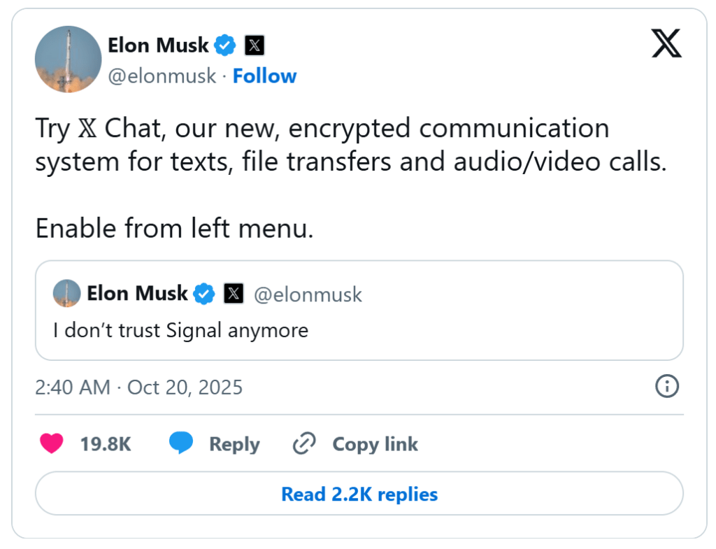 Why would Musk do this? He’s trying to promote his own, shittier encrypted chat software beta, the creatively named X Chat. X Chat is part of Musk’s quest to turn what was once Twitter into an “everything app,” despite the fact he’s shown little real indication he’s innovative enough to actually make X useful for anything outside of sports chat and fighting with racist crypto grifter bots.