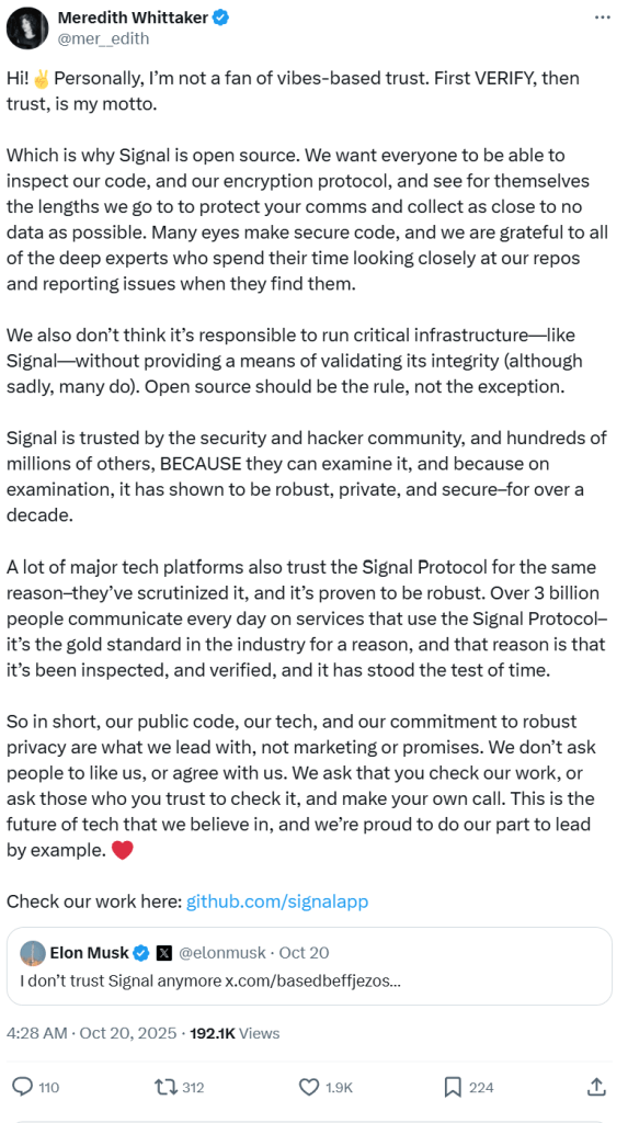 While Signal isn’t perfect and certainly has some dependencies on centralized infrastructure, the AWS outage didn’t create any specific risk issues related to encrypted Signal communications. Musk simply saw an opportunity to exploit the outage to market his barely-used beta software. Signal President Meredith Whittaker responded to Musk by noting that Signal was at least transparently open source: