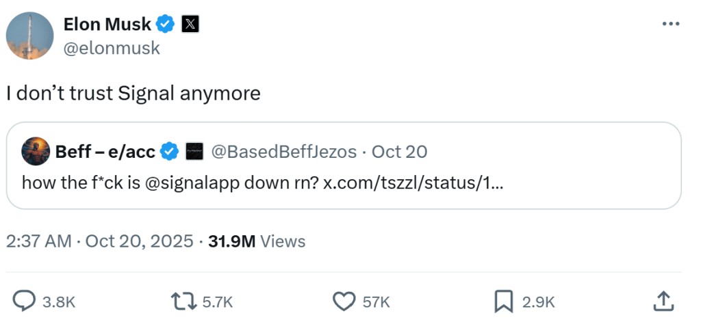 But because every brain fart Elon Musk has somehow warrants its own clickbait news cycle, what’s left of the U.S. press couldn’t help but amplify Musk’s criticism of Signal and parrot his attacks mindlessly: