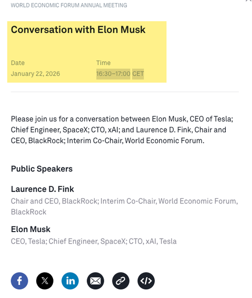 The WEF’s website has confirmed that Musk will speak with BlackRock CEO Larry Fink from 1630 to 1700 CET (or 1030 to 1100 EST). Bloomberg notes that Musk was a “last-minute addition” for the Thursday afternoon conference. Also, this will be Musk’s first WEF appearance.