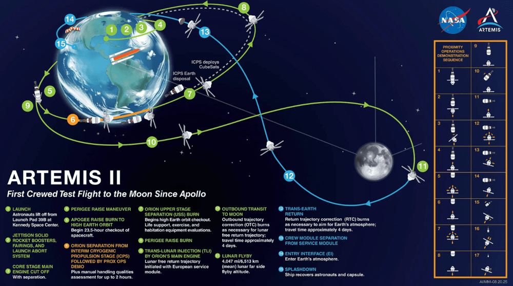 By April 10, Artemis II is forecast to re-enter Earth’s atmosphere, nine days and one hour after liftoff, and splash down off the coast of Southern California.