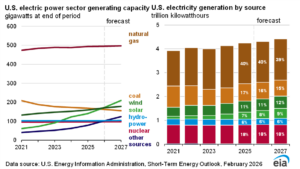 Natural gas, however, is still the major source of generation and the fuel of choice for data centers and manufacturers, supplying around 40% in both 2026 and 2027, according to EIA’s forecasts. Solar is expected to supply less than 10% as it is not as efficient, providing only about a quarter of the energy that natural gas can supply with the same amount of capacity. EIA projects only three gigawatts of new natural gas capacity coming online in 2026 and 2027.