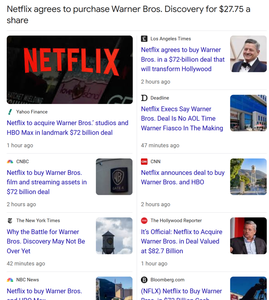 Meanwhile Netflix still has a hurdle to face: the weird zealots at the Trump DOJ and FCC. Paramount and/or the Trump administration has spent the last week seeding complaints in Republican-friendly media that the bidding process was unfair to Larry Ellison and CBS/Paramount, and that the Trump administration is concerned about the antitrust impact of a Netflix Warner Brothers combination.
