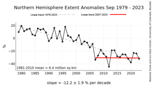 Arctic sea ice, p. 69: Many scientists, politicians, and media sources wrongly predicted Arctic sea ice would disappear in the summer. Satellite data show the summer minimum sea ice has not decreased at all since 2007, and instead has remained stable after a temporary low in 2012.