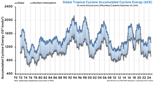 Global Tropical Cyclones, p. 22: There has been no increase in the number or intensity of tropical cyclones since at least 1972 as the planet has modestly warmed, and some data suggest tropical cyclone frequency has actually declined over the past century. Even the UN’s IPCC found no increase in the frequency or severity of tropical cyclones.