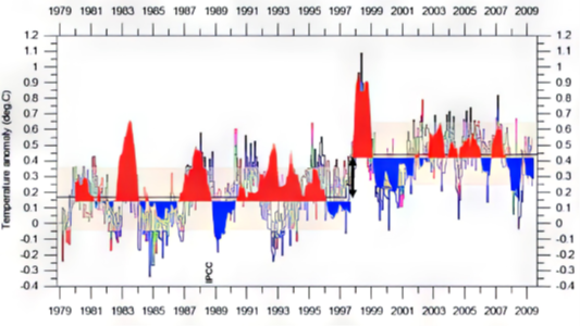 Ocean temperatures, p. 74: Ocean temperatures are driven by the El Nino Southern Oscillation, which can cause a flip from cold to warm in the space of a single year. The 1997 and 2015 Super El Nino events caused an upward shift in global ocean temperature that lingers today.