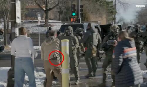 The agents continue to hold him down until he retreats and joins a crowd shouting at agents, as his gun is visibly tucked into the back of his pants.