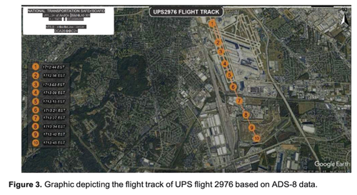 With the wing on fire, the air freighter managed only about 30 feet AGL before losing lift. It cleared the blast fence on Runway 17 Right at Louisville Muhammad Ali International Airport but struck the roof of a UPS warehouse with its left main gear, then crashed into a nearby industrial park.