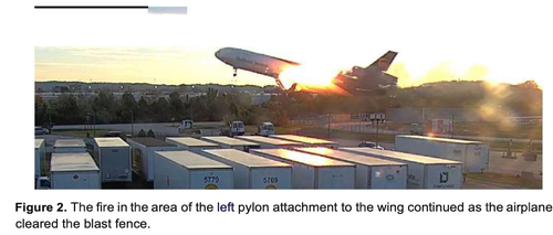 NTSB’s preliminary report showed the left engine (No. 1) and entire pylon assembly tore away from the wing immediately after rotation, igniting into a massive fireball.