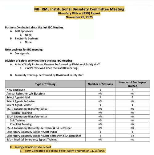 “Now, what we just uncovered is that in November 2025—just a couple months ago—quietly, NIH posted a biosafety test to see if there’s any from Rocky Mountain Lab, indicating that a select agent… Now, select agents are very deadly pathogens—serious health concerns for both humans and livestock. These are things used as bioweapons, things like ricin, anthrax, Ebola, tularemia. The Rocky Mountain Lab report just has a very benign item—if you didn’t know what we were looking for—one of these pathogens was either accidentally released, lost, or stolen from this NIH-funded bioagent lab that participates in dangerous animal experiments with the military.